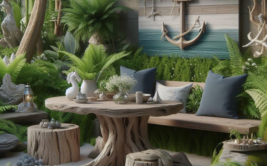 To truly complete your coastal garden theme, incorporate other decorative elements that reinforce the seaside aesthetic and tie everything together with your driftwood furniture.